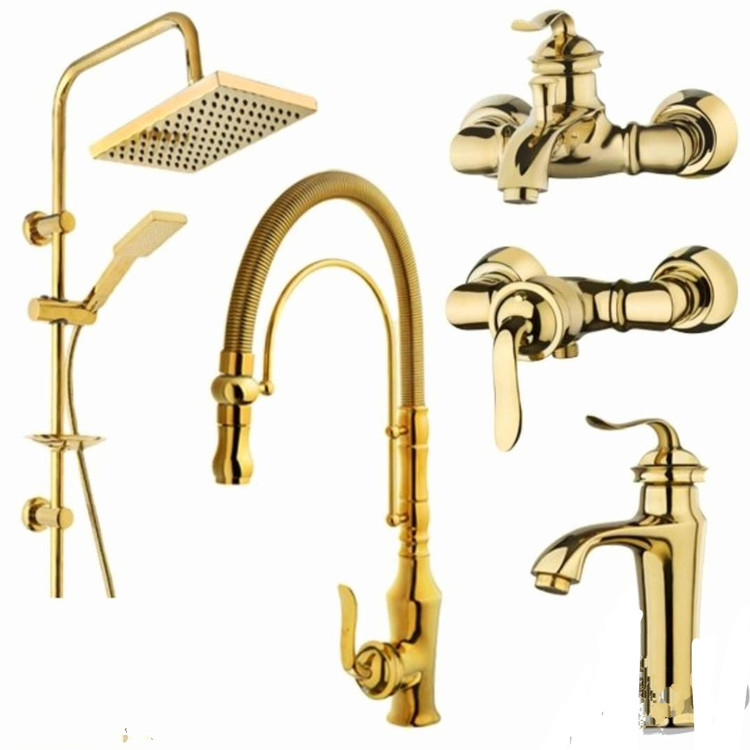✅️ست ۵ عددی شیرالات اهرمی بامبو طلایی فوق سنگین کروم با روشویی پایه بلند و دوش رسوبگیر طلایی دو کاره