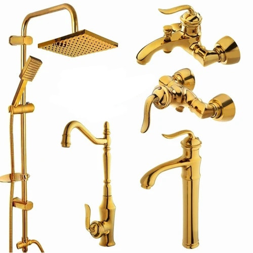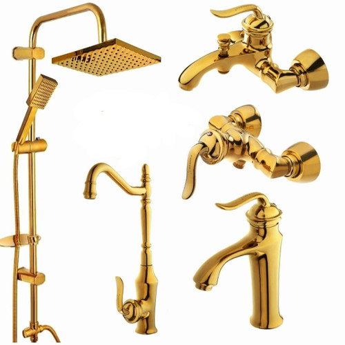 ست شیرالات اهرمی سنگین مدل بامبو طلایی با دوش دوکاره طلایی رسوبگیر دار